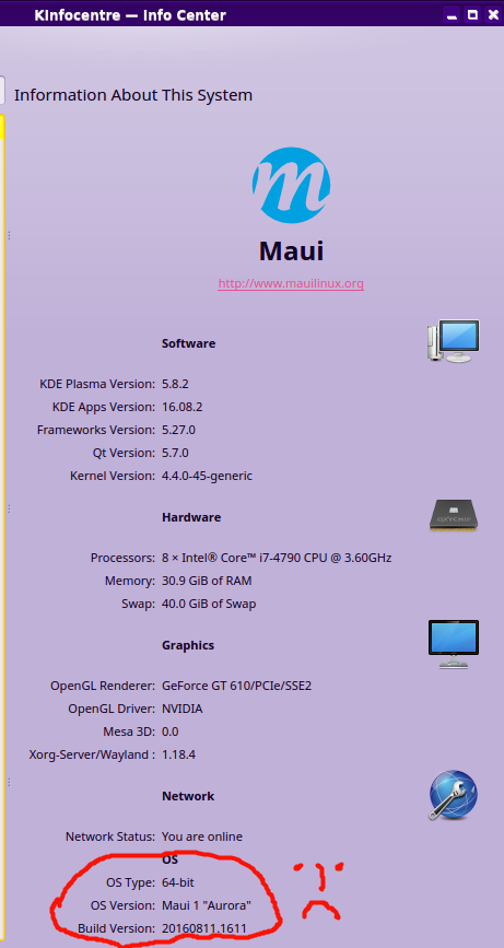[Solved] - Upgrade question - kdemeoz - 28th October 2016 Hi Starbuck. Congratulations on your new baby. I would like to ask for upgrade clarification pls. Do you remember this interchange we recently had [https://mauilinux.org/updating-maui-2-maui-backports/]? Quote:Starbuck2001 I thought you were meaning that we could upgrade Maui 1 to 2 simply via the normal Upgrade Manager, but now i read in your https://mauilinux.org/maui-2-blue-tang-released/ that "You can get the new version fresh from our download site ( https://mauilinux.org/download/ )" --> that sounds like we do after all need to download a new ISO, & thus do another total installation...? If that is correct, then i have a subsidiary question. To my frustration David has not replied to clarify the pretty astonishing statement he made, "Plausible, the encryption scheme even changed between the two releases", https://forums.mauilinux.org/showthread.php?tid=24027&pid=39965#pid39965. IF i need to d/l then fresh-install Maui 2 ISO, then given David's possible meaning, do you think i should now not only format my / with the Maui 2 install, but ALSO this time format & re-encrypt my /home, to avoid any possible conflicts of any old Mint 17 KDE config files buried in /home that might be conflicting with Maui? RE: Maui 2 - leszek - 28th October 2016 Quote:I thought you were meaning that we could upgrade Maui 1 to 2 simply via the normal Upgrade Manager, but now i read in your https://mauilinux.org/maui-2-blue-tang-released/ that "You can get the new version fresh from our download site ( https://mauilinux.org/download/ )" --> that sounds like we do after all need to download a new ISO, & thus do another total installation...? Thats only for new users. Existing users are already on Maui 2 for several weeks since we did the last big update Quote:If that is correct, then i have a subsidiary question. To my frustration David has not replied to clarify the pretty astonishing statement he made, "Plausible, the encryption scheme even changed between the two releases", https://forums.mauilinux.org/showthread.php?tid=24027&pid=39965#pid39965. IF i need to d/l then fresh-install Maui 2 ISO, then given David's possible meaning, do you think i should now not only format my / with the Maui 2 install, but ALSO this time format & re-encrypt my /home, to avoid any possible conflicts of any old Mint 17 KDE config files buried in /home that might be conflicting with Maui?Please lets discuss this matter on the thread already created. I am afraid I cannot help here as I don't know exactly what changed in kwallet in terms of encryption. RE: Maui 2 - AJSlye - 28th October 2016 NO, If you update your system via the cli or synaptic you are up to date, no need to reinstall. Re-installation or Upgrade path would only be needed from LTS base to LTS base, every two years. RE: Maui 2 - kdemeoz - 28th October 2016 Thank you both. Maybe i'm just being too frivolous; if the important code in my installation is now already same as Maui 2 then possibly that's the only thing that really matters... but it'd be kinda nice if it actually told me it's Maui 2: RE: Maui 2 - leszek - 28th October 2016 If you install the base-files package 99 from our repo it should tell you Maui 2 then