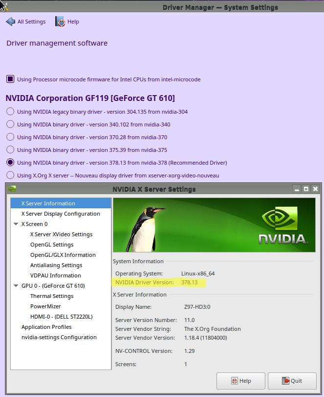 RE: Tower's 1st [no, 3rd] Hard-Reset since clean-reinstall. - kdemeoz - 24th February 2017 OK. Am about to reboot, having just done this: Code: Z97-HD3:~$ sudo prime-select intelRE: Tower's 1st [no, 3rd] Hard-Reset since clean-reinstall. - kdemeoz - 24th February 2017 Sadly, it didn't work. Tried rebooting twice, but both times it jammed at the 2nd splash-screen. Hence, as you indicated, i had to go to TTY, switch back to Nvidia, & reboot... & thus am now back here, with graphics status once more as: Am soon to Suspend Tower for the night, so will be interested to see what tomorrow morn's Resume attempt will bring... RE: Tower's 1st [no, 3rd] Hard-Reset since clean-reinstall. - rocky7x - 24th February 2017 Well in that case it seems that you don't have the Optimus technology even though you have 2 GPUs. I have no experience on how to enable that Intel GPU apart from taking the Nvidia card out. There certainly is an option with tinkering the X server parameters, but since I don't have a test case to test it, I cannot recommend an exact solution. So maybe indeed try to remove the Nvidia card or maybe someone more experienced would know how to switch to the Intel GPU. Now that I think more about it, at the beginning when you detected that you have 2 GPUs and both were being used, the reason for this was that you don't have Optimus, but have 2 GPUs and the system thinks both are used. That also can be the reason for the crashes. RE: Tower's 1st [no, 3rd] Hard-Reset since clean-reinstall. - AJSlye - 25th February 2017 None of this thread makes any sense. If the system has an onboard Intel GPU, and you add in a dedicated PCIe card (NVIDIA), then the on board Intel gpu should be automatically disabled by the system. RE: Tower's 1st [no, 3rd] Hard-Reset since clean-reinstall. - kdemeoz - 25th February 2017 (24th February 2017, 20:59)rocky7x Wrote: Well in that case it seems that you don't have the Optimus technology even though you have 2 GPUs. ... So maybe indeed try to remove the Nvidia card or maybe someone more experienced would know how to switch to the Intel GPU. Though i have made separate thread/s for my Lappy [does have Optimus], THIS thread is about my Tower. As you yourself said, in that separate unrelated Lappy thread https://forums.mauilinux.org/showthread.php?tid=24247&pid=41490#pid41490: Quote:So I'm completely not surprised by the fact that the Tower went without any problems (since it doesn't have Optimus for sure) and the Laptop went to hell (since it probably has Optimus). Given Optimus is just one of the [very very many] things i know little or nothing about, i did some brief research. On https://www.nvidia.com/object/optimus_technology.html, only Laptops / Notebooks are mentioned wrt Optimus, not Towers/Desktops. On http://www.geforce.com/hardware/technology/optimus/supported-gpus?field_gpu_type_value=All&page=1, only M-suffix gpu cards are listed, which i presume denotes "mobile", so my Tower's NVIDIA GF119 [GeForce GT 610] is not listed, hence i further intuit that my Tower does not / cannot have Optimus. Though i've heard of it over the past few years, albeit in many fora with wildly contradictory opinions of good vs bad, i also know nearly nothing about Bumblebee, so i also briefly researched that. I could not form a firm conclusion, but hazard to guess it would also be irrelevant to my Tower given my non-M Nvidia card...? Quote:https://github.com/Bumblebee-Project/Bumblebee/wiki/FAQ Having re-read my separate Lappy thread for excerpts above, i therein rediscovered a tricky command you gave me, which i've now run on Tower: Code: Z97-HD3:~$ lspci -vnnn | perl -lne 'print if /^\d+\:.+(\[\S+\:\S+\])/' | grep VGAAs with Lappy, i still don't understand how to fully interpret that info, but have provided it here in case it somehow helps. It was last night that i made that latest attempt to prime-select intel gpu, then given its boot freeze at 2nd splash-screen i reverted again to nvidia gpu & driver, thus this morning was the first Resume after the night's Suspend status. Tower awoke correctly, no freeze at login screen, no freeze during the subsequent hours of operation to now. What did happen though, consistent with every other time i use the Nvidia driver rather than the Nouveau driver for the Nvidia gpu, are these graphics faults [Cairo-Dock, then desktop icons]: Though those glitches are hardly the end of the world, & fixing them each day is easy [til the next morning's repeat], i really intensely dislike getting them [makes my pc feel "cheap"]. IMO this is a substantial advantage of the Nouveau driver over the Nvidia driver... none of those pixelation problems ever happened to me even once when i was using Nouveau. This is part of my "hesitation" at having to perform that "blacklist Nouveau" procedure, as it seems to me that i would then be locking myself into a state of permanent daily Cairo-Dock & desktop icons distortions. BTW, another graphical black-mark against the Nvidia driver, & green tick for the Nouveau driver, is that the former frequently generates KWin warning messages that "a graphics reset occurred", when i routinely use various standard KWin Desktop Effects [eg, change from VDx to VDy or VDz via Desktop Grid, or Desktop Cube, or desktop mouse-wheel-roll, or pushing a window over to another VD, etc]. In contrast [& initially to my immense surprise], Nouveau does not misbehave for me like that. --> You can see that, despite my initial contrary view in previous months, i have come to much prefer Nouveau over Nvidia driver, & really, if there's another freeze even though i've now installed HWE, it's likely that my next step would be to revert to Nouveau [logic = even if that also still then suffers freezes, like both it & Nvidia drivers did before HWE, it at least provides me a superior "user experience" in between freezes]. I also continue to feel "hesitant" about the physical removal of the Nvidia card... both (A) in terms of being a bit scared at having t