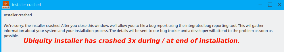 Three times i tried this, & 3x Ubiquity crashed prior to completing the installation. Each time was with the option ticked to encrypt /home [maybe it might work without this, but that's useless coz then i might as well just use Calamares]. 2X was with /sda [=MBR] selected for bootloader location, & 1X was with /sda1 [= /] selected... still crashed. Net effect is that so far Maui2 cannot be clean-installed (if i want /home encrypted ...which i DO].