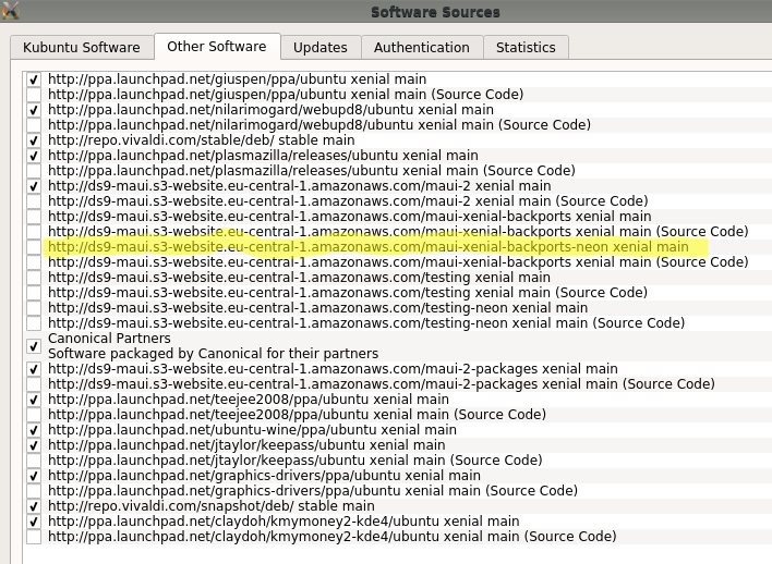 Quote:In order to get the "Maui-Devs-tested-released" Neon updates, which is what i assume you mean comes from "the backports repo", is the row i've highlighted in my pic, one that i need to tick pls?Yes exactly that. Quote:If any user did not have that row ticked, would it mean they would not receive any further Plasma version updates until Maui 3 was released?Exactly