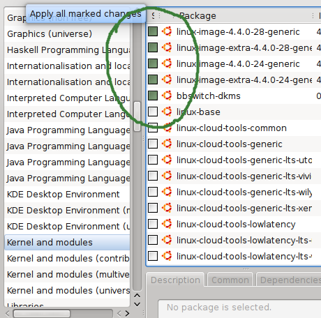For my tastes [& eyes] the first pic is vastly more user-friendly than the second. I really struggle to clearly, easily & quickly discern in Maui's Synaptic what packages are marked selected. The tiny almost invisible pale blue ticks are nearly impossible to discern.