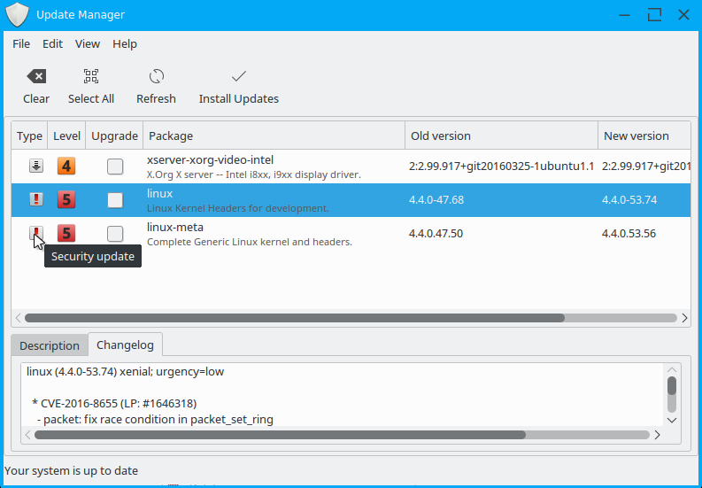 ...and update manager (see screenshot attached) is listing an kernel update: it says "security update)" but it is a level five update and in the preferences, a level description for 5 is: "Dangerous update.  Known to affect stability..." etc etc.