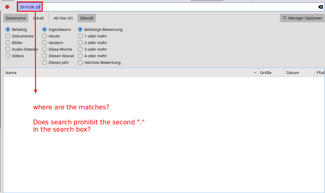 Please see attached screenshots. If I do not fully enter the search date, the Dolphin search is ok, but after entering the term after the second "." it does not work. Either I overlooked something or there is a limitation or a bug.