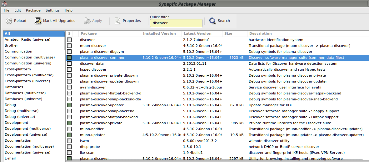 Personally i find Discover kind of sucky, but i do know that some people like Discover, so fyi, you can always install it if you wish. You could do it via Konsole, or via Synaptic [ironic, huh?]. Pic for the latter: